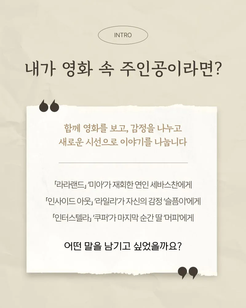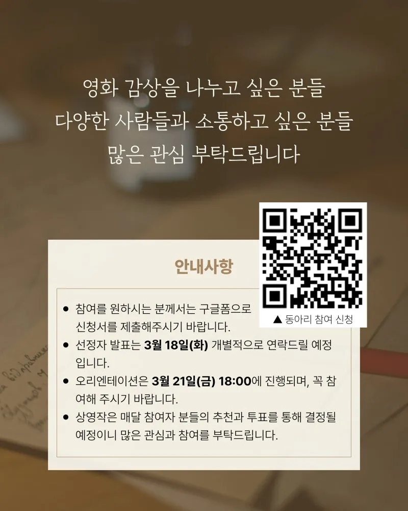 영롱(玲瓏): 빛나고 또렷하다 - 영화가 지닌 빛을 발견하고, 그 울림을 또렷하게 나누는 모임 🎬혼자 보는 영화, 심심하지 않으신가요? 영화에 대한 깊이 있는 감상을 나누고 싶은 분, 영화를 통해 다양한 사람들과 소통하고 싶은 분을 초대합니다! ‘영롱’에서는 단순히 영화를 감상하는 것을 넘어, 함께 이야기하고 새롭게 해석하는 시간을 갖습니다. 💡내가 영화 속 주인공이라면? 영화 속 주인공의 입장에서 편지를 써보는 특별한 창작 활동을 진행합니다. 「라라랜드」 ‘미아’가 되어 세바스찬에게 편지를 쓴다면? 「인사이드 아웃」 ‘라일리’...