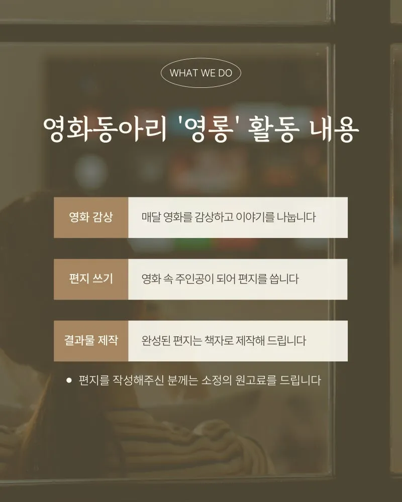 영화감상, 편지쓰기(소정의 원고료, 결과물 제작