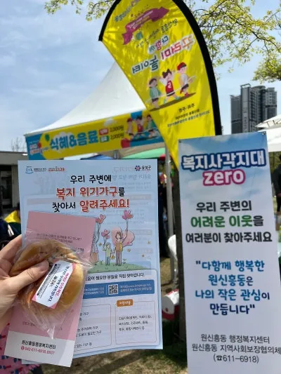 원신흥동 행정복지센터에서 우리 주변의 복지위기 가구를 찾아 필요한 지원을 받을 수 있게 하는 '복지사각지대 ZERO' 캠페인도 진행 중이었습니다. 맛있는 빵과 안내 팸플릿을 함께 나눠주시며 많은 주민이 관심을 가질 수 있도록 홍보를 진행하고 있었습니다.