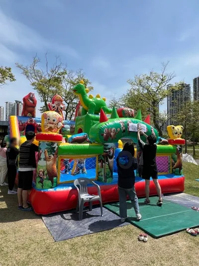 놀이 꾸러미는 상시로 이용 가능한 에어바운스, 무대에서 진행된 OX 퀴즈, 림보게임, 퀴즈대회, 몸으로 말해요 등 다양한 게임들이 준비되어 있었습니다. 에어바운스는 줄을 선 후 15분씩 이용 가능했으며, 많은 아이들이 재미있게 이용할 수 있었습니다.