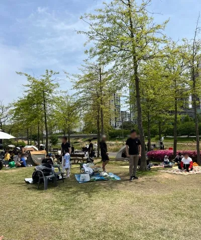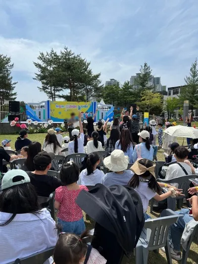 작은내수변공원 곳곳에 돗자리와 그늘 텐트를 펼친 많은 가족들이 어린이날 행사를 즐기기 위해 모여있었습니다. 행사장 내에는 행사 순서를 한눈에 볼 수 있는 안내판이 설치되어 있어, 방문객들이 편리하게 행사 일정을 확인할 수 있었습니다.