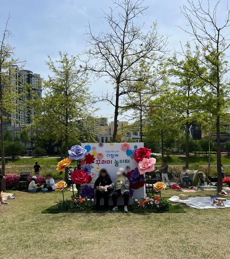 공원 한쪽에는 다함께 꾸러미 놀이터 행사의 포토존이 마련되어 있어 많은 사람들이 사진을 찍으며 오늘의 즐거운 추억을 남겼습니다.