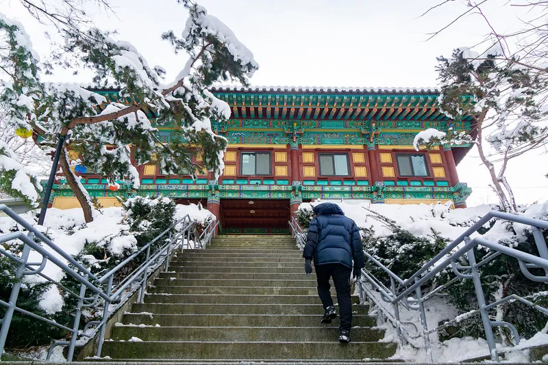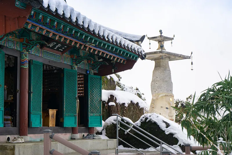 관촉사 대광명전에 들어가서 비로자나불을 보고 싶었지만 눈 때문에 법당과 전각은 모두 문이 닫혀 있었습니다. 법당 문을 열고 들어서는 일은 불자가 아니라면 쉽지 않은데요. 그래서 오늘 관촉사를 찾은 목적인 설경을 보기 위해 주변을 둘러보기로 했습니다.