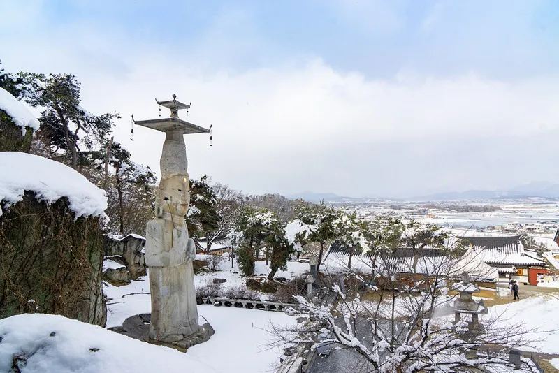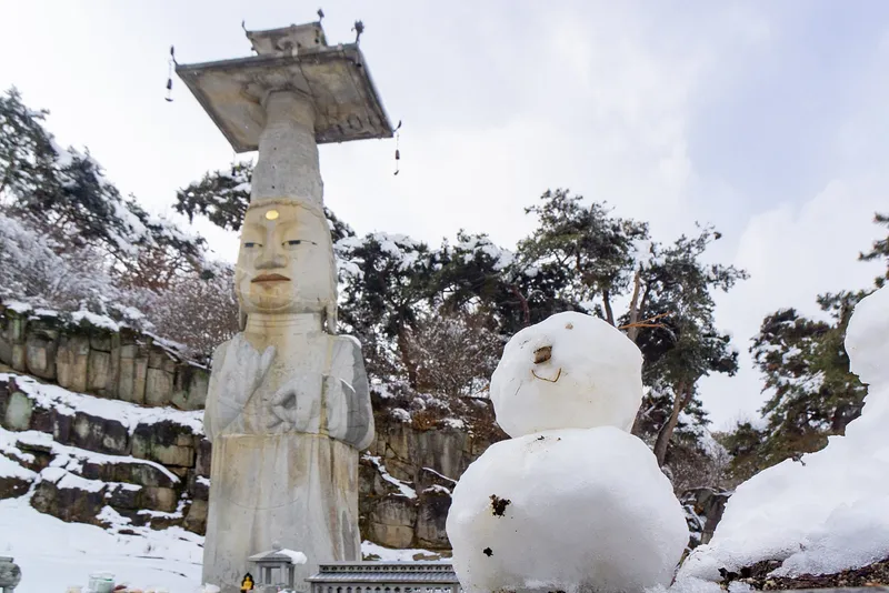 누군가 은진미륵 앞에 작은 눈사람을 만들어 놓았는데요. 천년을 견딘 은진미륵과 날씨가 따뜻해지면 금방 녹아 없어질 눈사람이 대조를 이룹니다. 하지만 불가의 가르침에 따르면 모든 존재는 고정되고 독립적인 실체가 아니기 때문에 두 존재는 대조적이면서 서로 연결된 하나의 실체이기도 합니다.