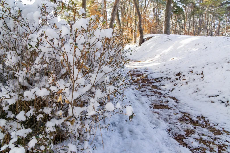 김홍신문학관 옆에 반야산 숲길로 오르는 계단이 있습니다. 봄에는 영산홍으로 붉은 길이 온통 하얗습니다. 눈길을 걸어야 해서 등산화를 신고 체온 유지를 위해 옷도 따듯하게 입었는데요. 겨울에는 낮은 반야산도 제대로 갖추고 산책을 나서야 합니다.