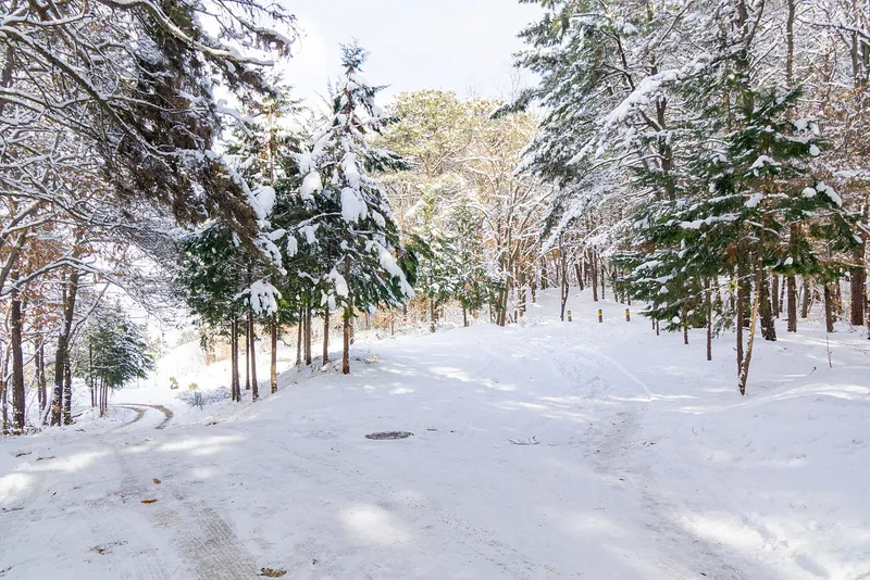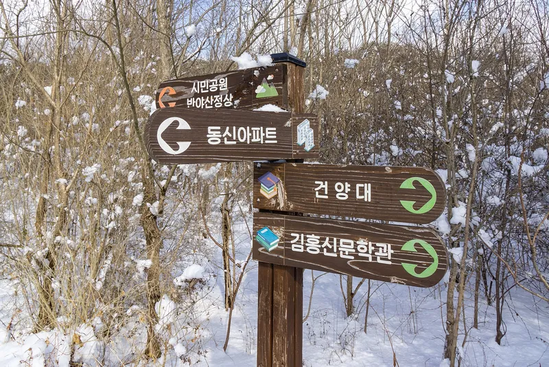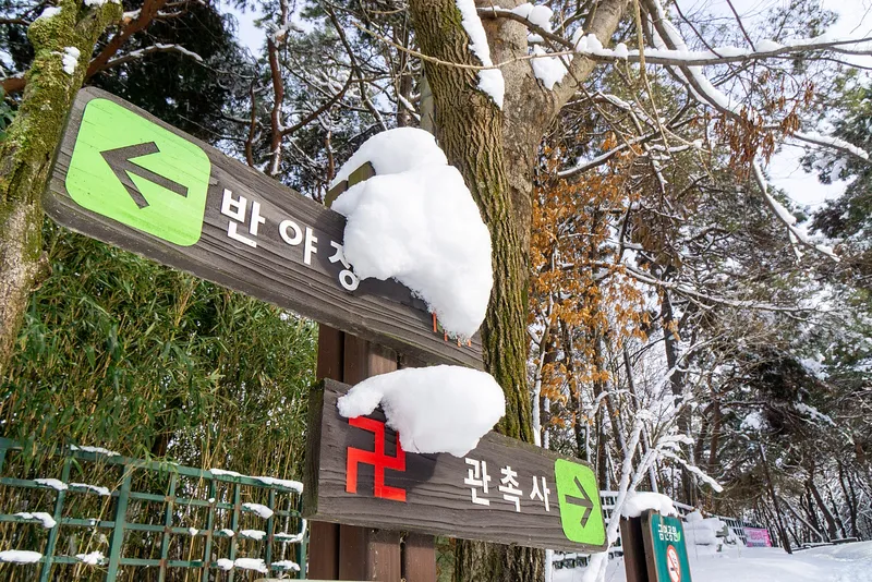 반야산 정상을 향해 걷다 보면 두 갈래의 길이 나옵니다. 왼쪽 길은 논산시민가족공원으로 이어지고 오른쪽 길은 반야산 정상 너머의 관촉사로 가는 길입니다. 저는 관촉사의 설경을 보기 위해 반야산 정상으로 가는 길을 선택했습니다.