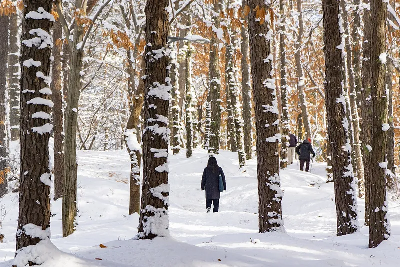 설 연휴 동안 전국적으로 눈이 많이 내렸는데요. 앞서가는 시민들의 뒤를 따르며 사진을 찍어 보았는데 반야산 숲길이 첩첩산골의 눈 쌓인 풍경처럼 보입니다.