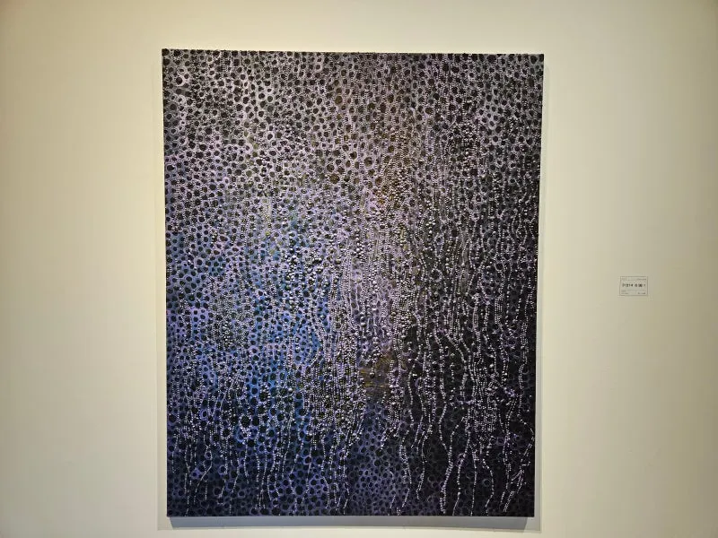 최지영 작가의 작품은 한지 위에 점을 찍고 선을 긋고 원을 쌓아가는 과정을 통해 자신을 성찰하면서 수행하는 마음으로 명상음악을 들으면서 그려낸 결과물이었다.