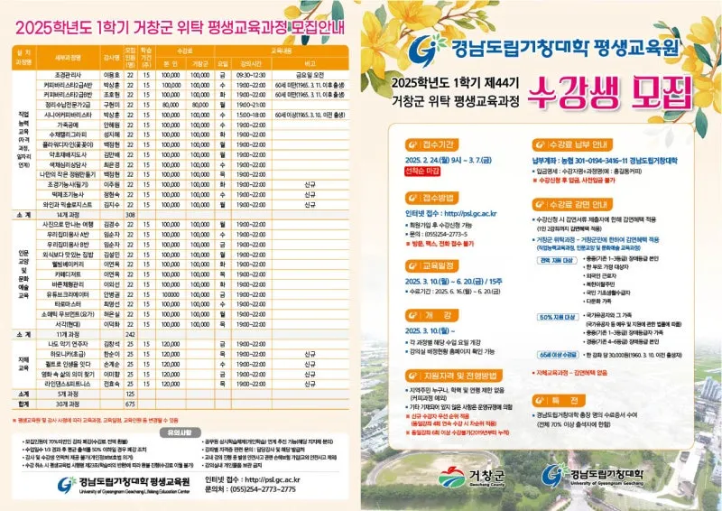 경남도립거창대학에서 2025년 1학기 평생교육과정 수강생을 다음과 같이 모집 안내하고 있습니다.