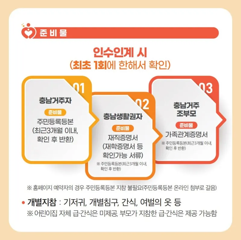 개별지참 : 기저귀, 개별침구, 간식, 여벌의 옷 등