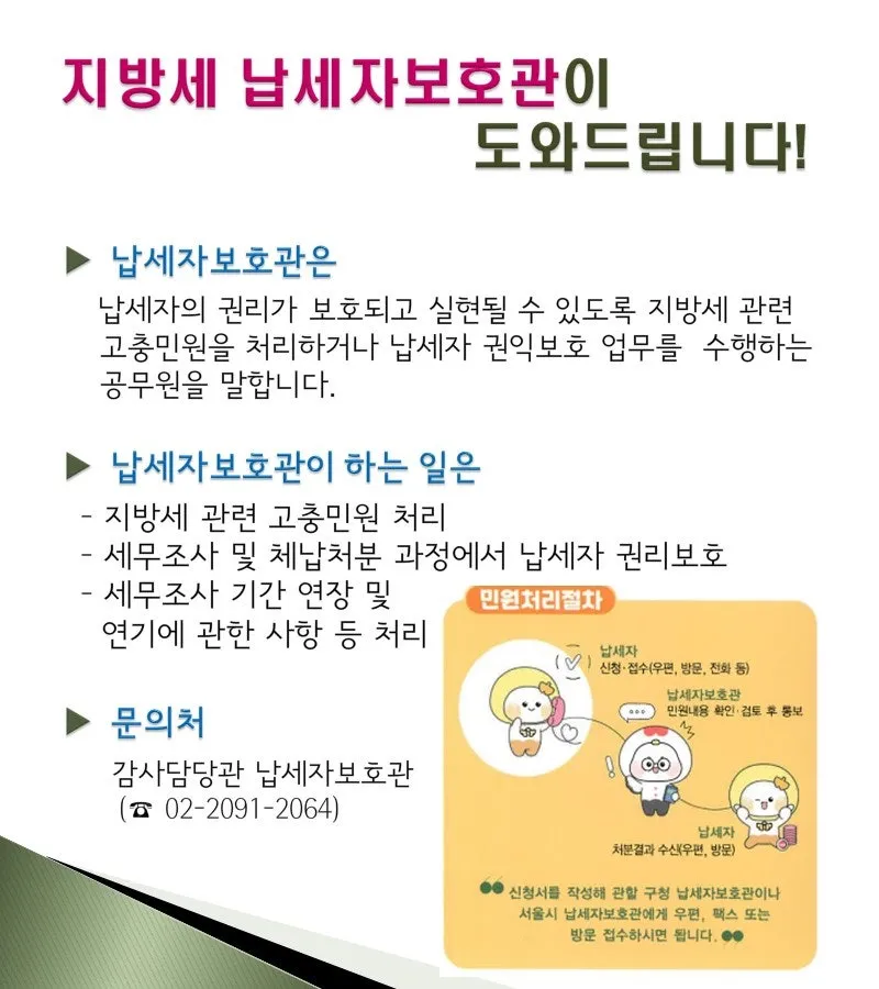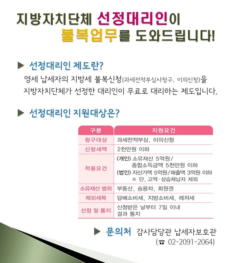 지방세 선정대리인 제도는 영세 납세자의 지방세 불복신청 (과세전적부심사청구, 이의신청)을 지방자치단체가 선정한 대리인이 무료로 대리하는 제도입니다.