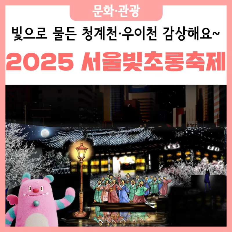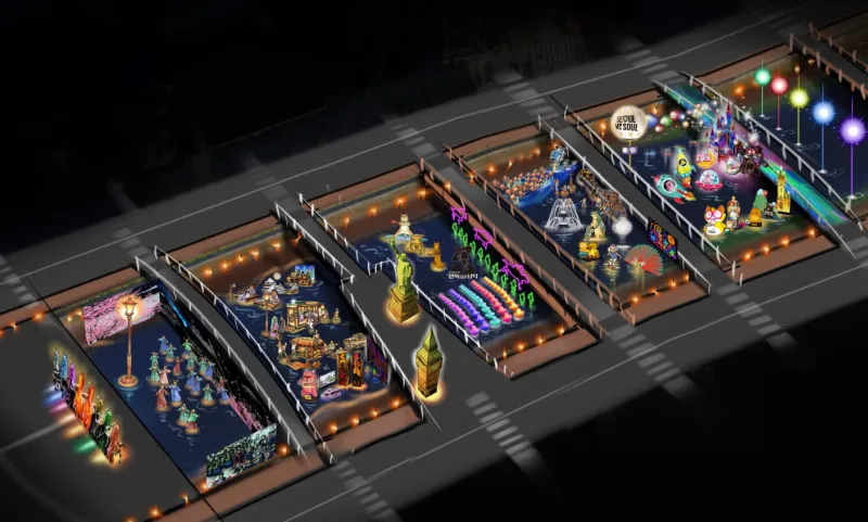 나의 빛, 우리의 꿈, 서울의 마법 <2025 서울빛초롱축제> - 청계천과 우이천 일대를 400점 이상의 빛 조형물과 미디어아트로 채워 마법 같은 순간 선사 * 오로라 연출로 특별한 경험 제공과 음향, 안개 등을 사용한 특별한 연출 - 청계광장, 광통교, 광교, 장통교를 시작점으로 하는 4개 구역에 서로 다른 테마 조성 - 포켓몬코리아, 농심, 대만관광청, 프라하시 관광청, 체코관광청 등 다양한 기업·기관 참여로 풍성한 콘텐츠 제공 |