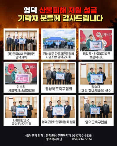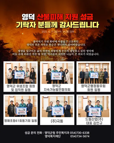 영덕 산불피해 지원 성금 기탁자분들께 진심으로 감사드립니다.