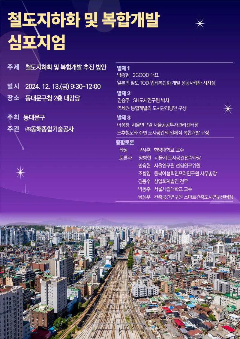 동대문구에서 분야별 전문가와 함께 하는 <철도지하화 및 복합개발 심포지엄>을 개최합니다! 누구나 자유롭게 참여 가능하니 많은 관심 부탁드려요⭕ |