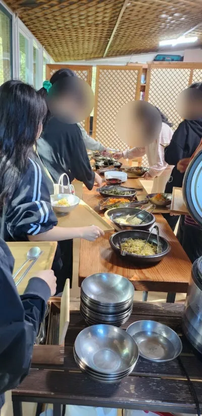 본관으로 돌아와 발 씻는 곳에서 깨끗이 씻고 준비된 식사를 하러 갔습니다.