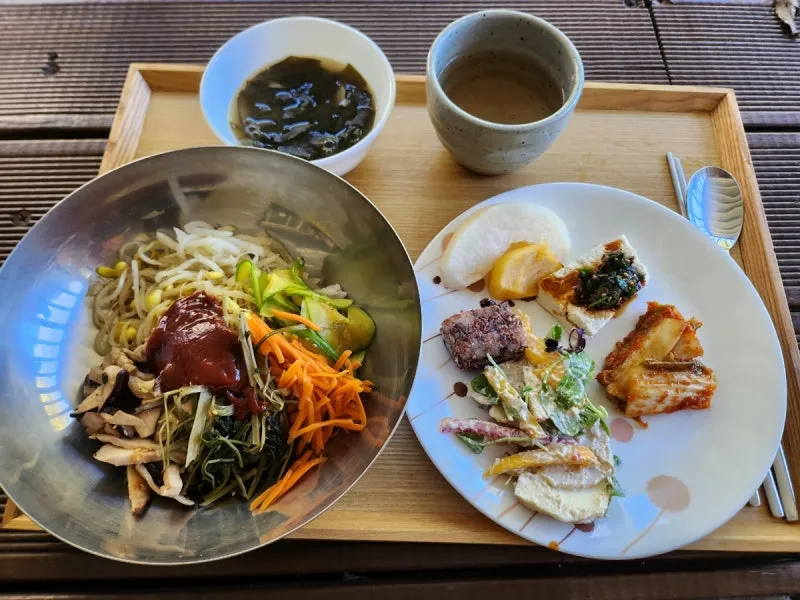 준비된 음식은 비건식으로 다양한 나물들과 샐러드, 김치, 두부와 과일, 미역국~! 푸짐한 한상이 준비되었습니다.