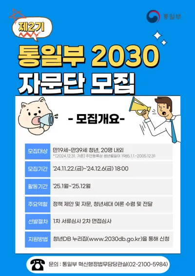 제2기 통일부 2030자문단 모집 공고 진행 기간 2024-11-22 09:00 ~ 2024-12-06 18:00 작성자 안국현 등록일 2024-11-21 조회수 1114 페이스북 공유 트위터 공유 1. 모집 개요 가. 모집 분야 : 통일부 ‘2030 자문단’ 나. 모집 인원 : 20명 내외 다. 임기 : 위촉일로부터 1년(‘25.1월~’25.12월) * 연임가능 라. 주요역할 - 통일부 정책 모니터링 및 제언 - 청년세대 여론 수렴 및 전달 - 기타 청년정책 과제 발굴 및 제안 등 * 관련분야 : 북한인권, 북한이탈주민 정착지...