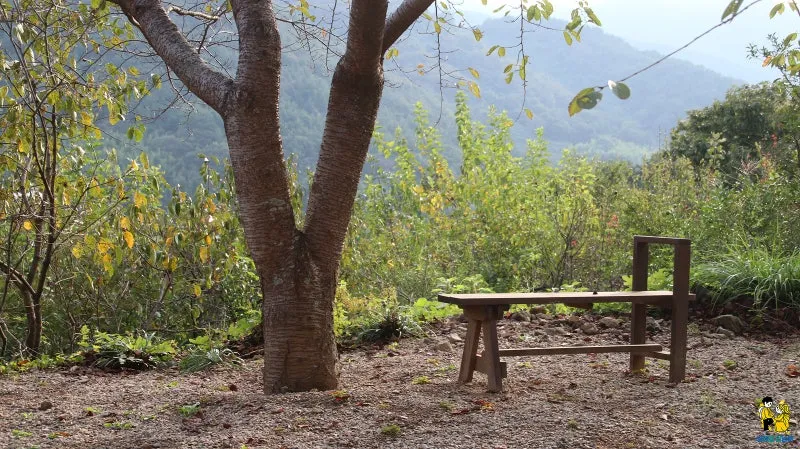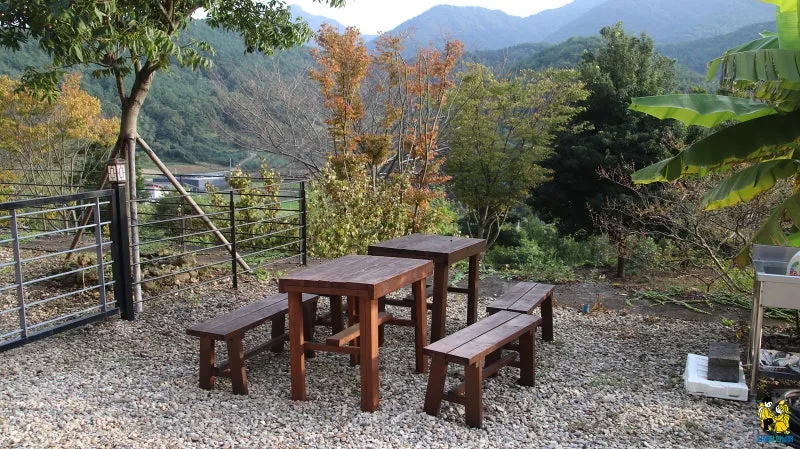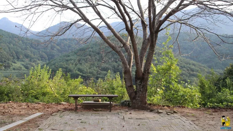 일주문을 지나면 나무 아래 쉼터 의자가 놓여 있는 것이 보입니다.