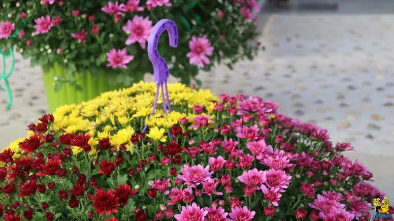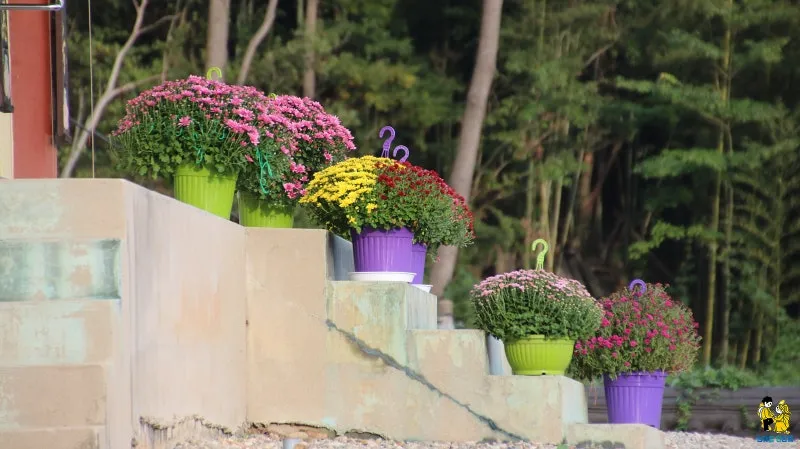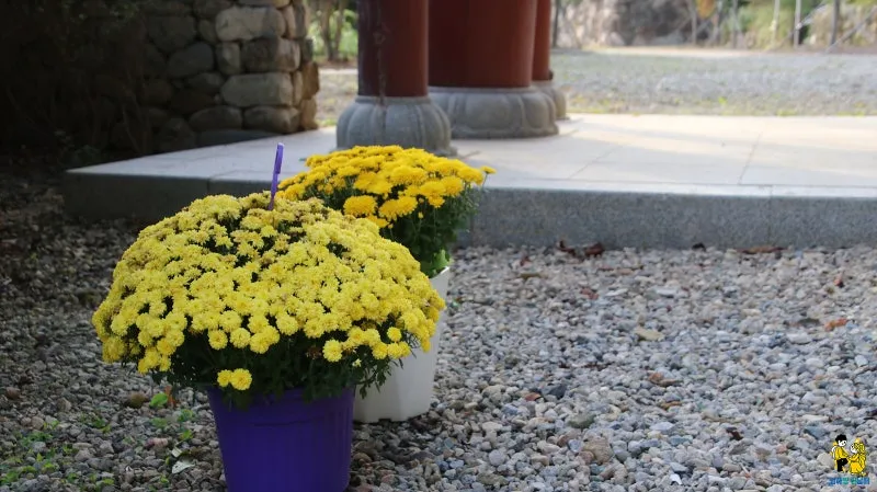 사찰을 작은 꽃밭으로 만들어버리는 국화 화분들이