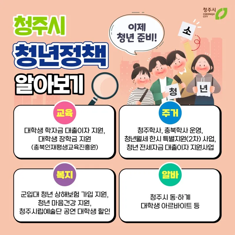 사회초년생으로서 사회에 첫 발을 내딛게 될 고3 학생들과 수험생 여러분을 위해 청주시에서 추진되는 교육, 주거, 복지 관련 청년정책들을 소개해 드리겠습니다!