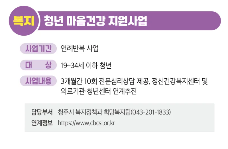청주시에서는 청년 마음건강지원사업도 추진하고 있습니다. 19세~34세 이하 청년이 해당되며, 3개월간 10회 전문심리상담을 제공하고, 정신건강복지센터 및 의료기관·청년센터에 연계해 우리 청년분들을 도와드리고 있습니다.