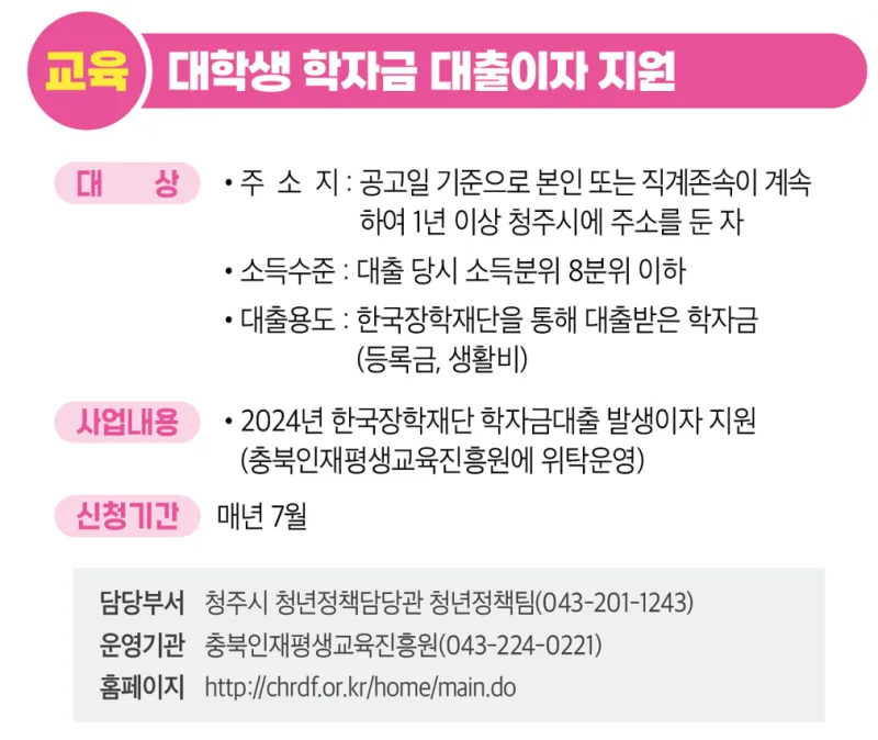 주소지가 공고일 기준으로 본인 또는 직계존속이 계속하여 1년 이상 청주시에 주소를 둔 자로 소득수준과 대출용도가 한국장학재단을 통해 대출받은 학자금인 경우에 발생되는 이자를 지원해 줍니다. 신청기간은 매년 7월입니다.