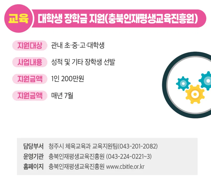충북인재평생교육진흥원에서 운영하는 대학생 장학금 지원사업도 있습니다.