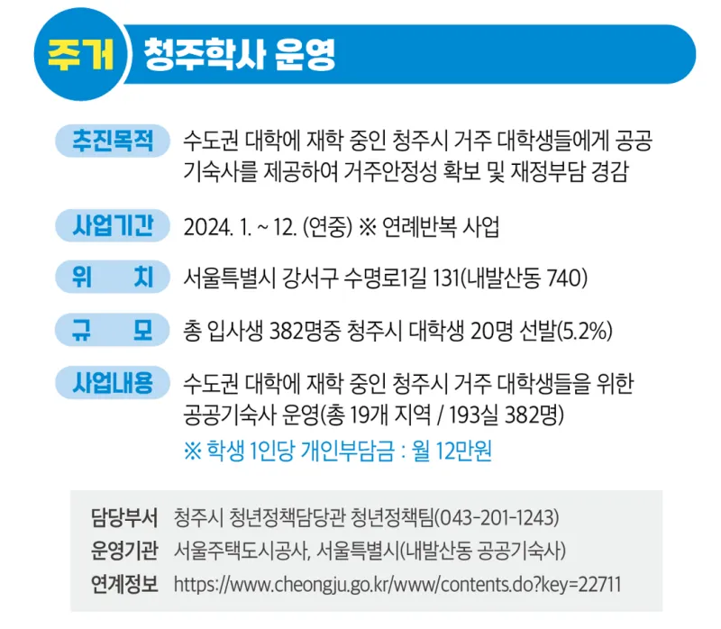 수도권 대학에 재학 중인 청주시 거주 대학생들에게 공공 기숙사를 제공하여 거주안정성 확보 및 재정부담 경감을 위해 운영되고 있는 청주학사를 이용해 보세요~!