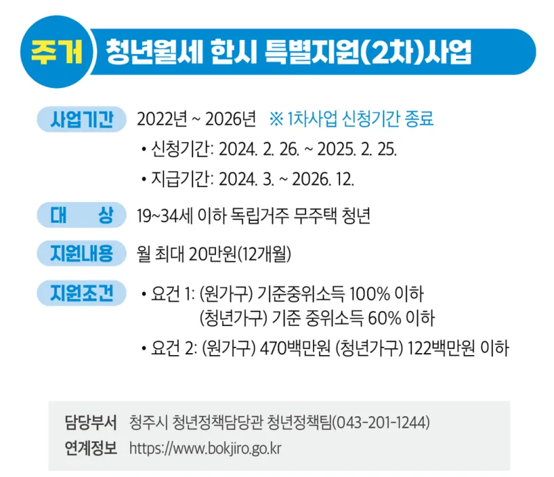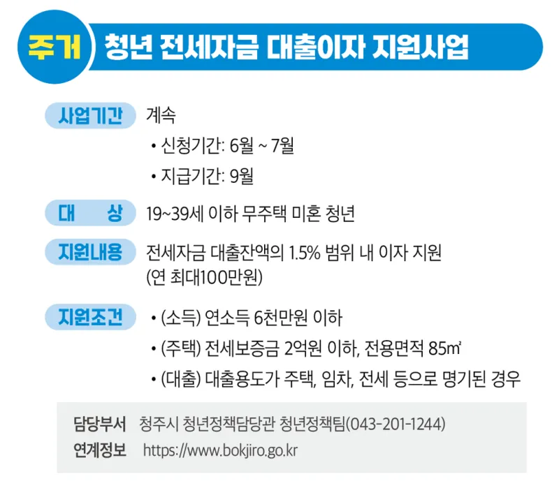 신청 시기는 매년 6월~7월입니다. 기타 자세한 사항은 청주시 청년정책담당관에 문의해 주세요!