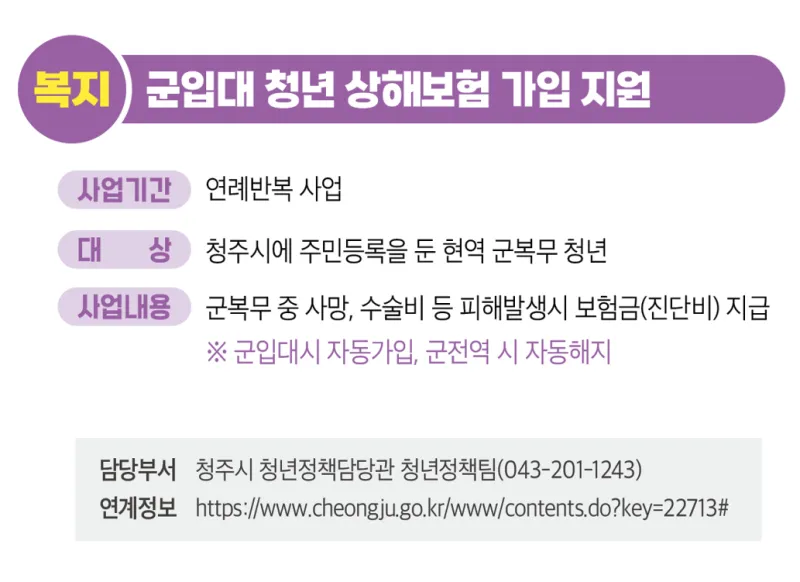 청주시에 주민등록을 둔 현역 군복무 청년이라면 누구나 군입대시 자동으로 청주시 군입대 청년 상해보험 가입을 지원해 드립니다.