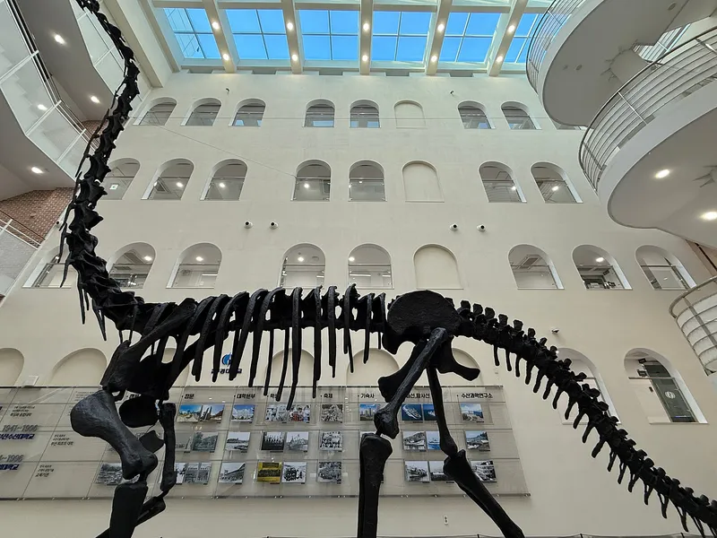 천년부경룡, 부경공룡이라 불리는 부경고사우루스는 부경대학교 환경지질과학전공 발굴팀이 1998년 경남 하동군 금성면에서 화석을 발굴해 복원한 몸길이 15m로 추정되는 초식 공룡입니다. 청운관 1층 정문으로 들어오시면 볼 수 있습니다.