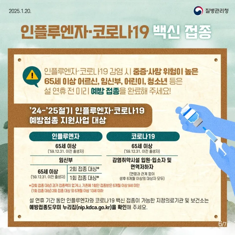 웰로327일 전설 연휴 감염병 예방수칙 감염병 예방으로 건강하고 안전하게 호흡기 감염병 예방 관리 수인성·식품 매개 감염병 예방 관리 모기 매개 감염병 예방 관리 해외여행 건강 관리 인플루엔자·코로나19 백신 접종 모두 건강하고 안전한 설 명절 보내세요! {"title":"설 연휴 감염병 예방수칙","source":"https://blog.naver.com/seocheonpr/223735787162","blogName":"Seocheon","domainIdOrBlogId":"seocheonpr","nicknameOrBlogId":"서천군청","logNo":223735787162,"smartEditorVersion":4,"lineDisplay":true,"outsideDisplay":true,"cafeDisplay":true,"blogDisplay":true,"meDisplay":true} #설#연휴#감염병#예방수칙#호흡기#코로나19#해외여행출처:https://blog.naver.com/seocheonpr스크랩