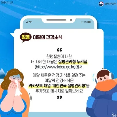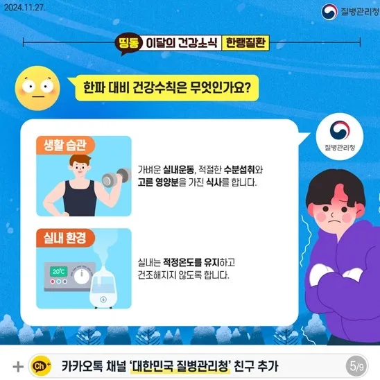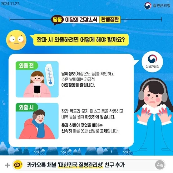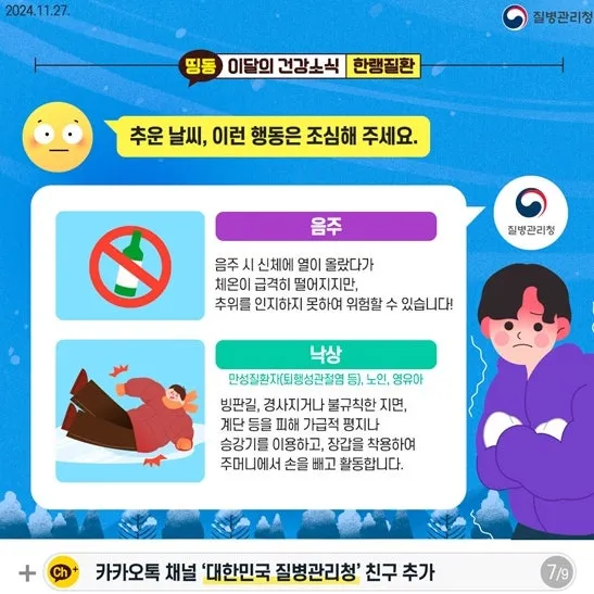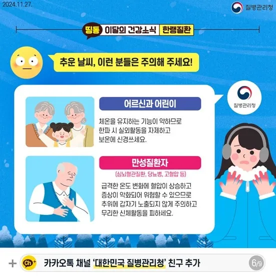 급격한 온도 변화에 혈압이 상승하고 증상이 악화되어 위험할 수 있으므로 추위에 갑자기 노출되지 않게 주의하고 무리한 신체활동을 피하세요. |