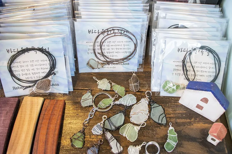 해양 쓰레기인 바다 유리로 만든 목걸이, 원목 트레이와 스피커 등 자연 친화적 제품입니다.