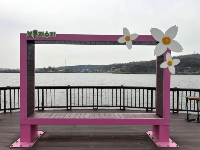 셋째, 데크길을 따라가다 보면 탁 트인 저수지 뷰와 인생샷 명소를 만날 수 있습니다. 핑크색에 하얀 꽃잎이 붙어 있어서 사진을 찍으면 색감이 참 예쁘게 나오는 포토존인데요. 공연을 할 수 있게 작은 광장으로 조성되어 있어서 여름엔 이곳에서 버스킹도 만날 수 있습니다.