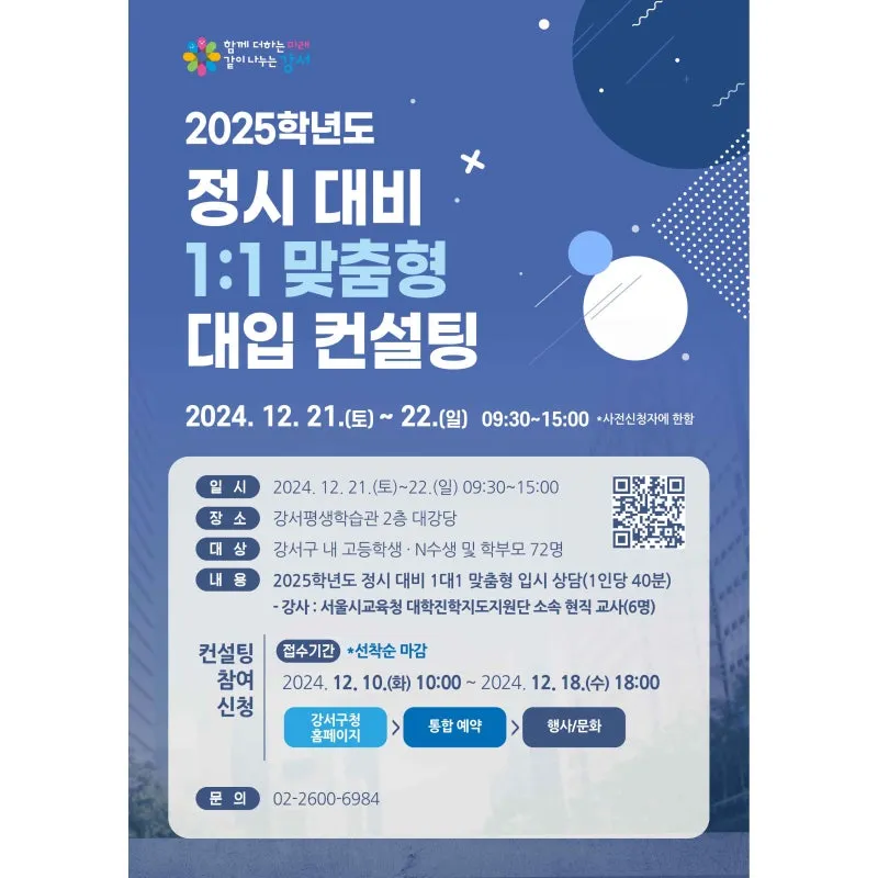 ✅ 학생 1명당 1일 1회 상담으로 제한됩니다. ✅ 컨설팅 신청 및 참여는 가급적 대상 학생 본인이 해 주시기 바랍니다. ✅ 선착순 마감 시 모집 조기 종료합니다. ✅ 강서구 거주 학생 및 학부모만 접수 가능합니다. |