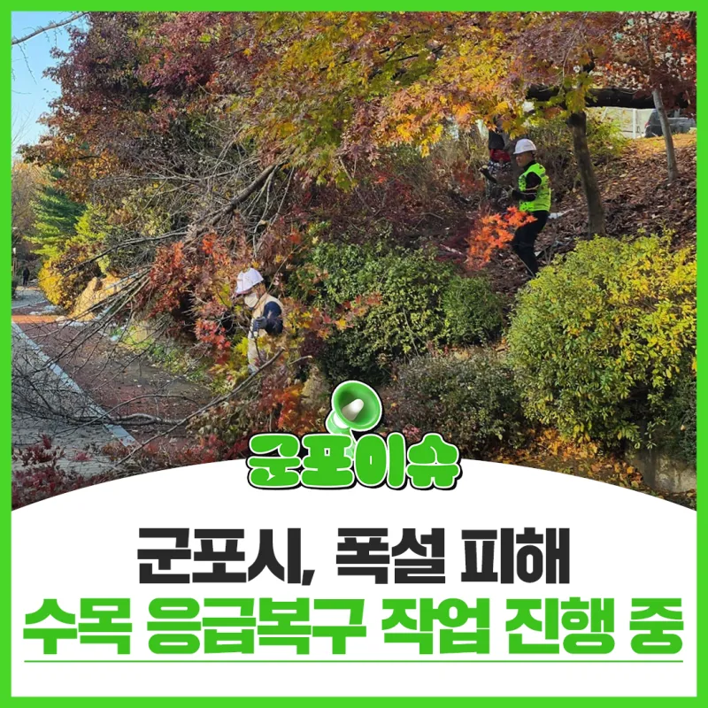 군포시는 지난 11월 27일부터 28일까지 내린 폭설로 인해 가로변 녹지, 공원, 산림 내 수목 약 2,980주가 피해를 입은 상황을 신속히 복구하기 위해 예비비 및 경기도 재난관리기금을 사용할 계획을 확정하고, 응급복구 작업에 착수했다고 밝혔다.
