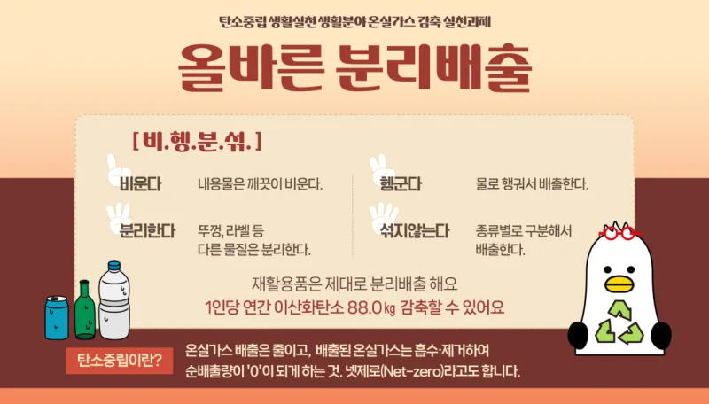 올바른 분리배출 방법은 비.헹.분.섞 만 기억하세요!
