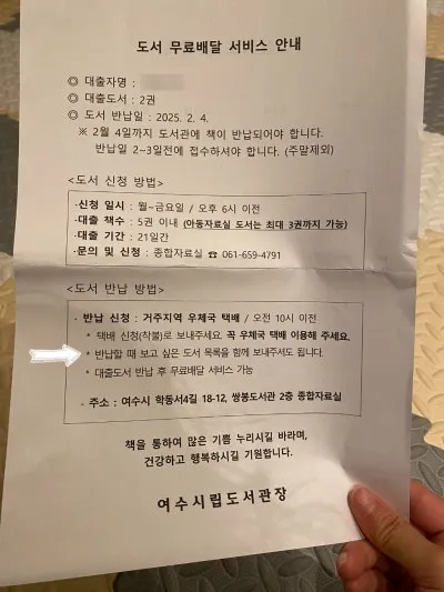 저는 직접 도서관에 방문하여 반납을 했지만, 무료배달서비스는 반납까지 택배로 가능합니다.