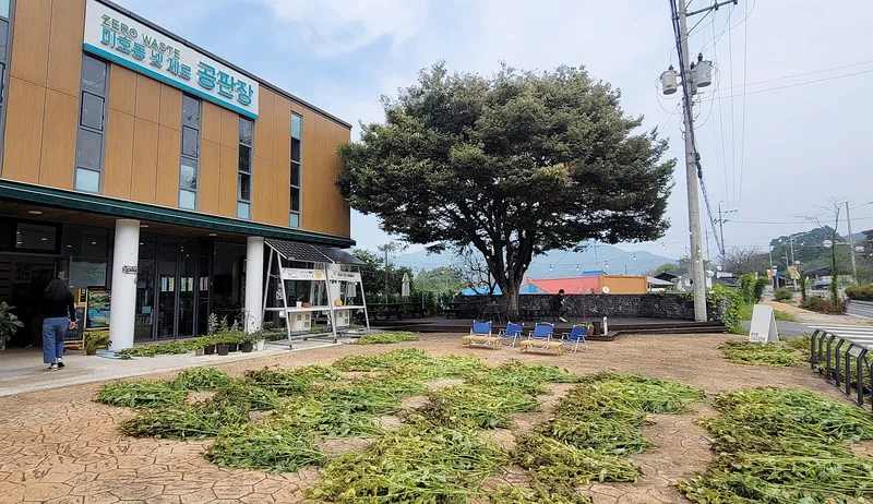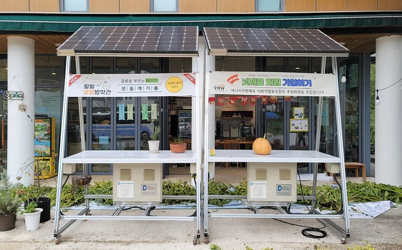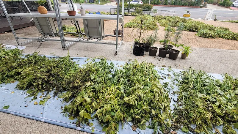 넷제로공판장 앞에 있는 태양광 발전 시설을 부착한 이동식 전시대 위에 '윙윙 꿀벌방앗간'과 '생들깨기름'이란 말에서 힌트를 찾을 수도 있었습니다. 넷제로공판장 앞의 넓은 공간에 누워있는 식물이 모두 들깨인 듯합니다.