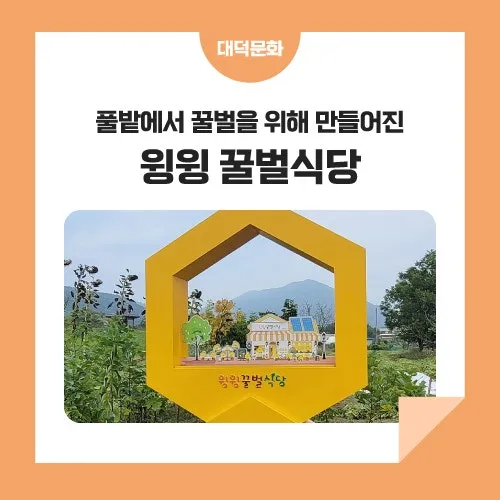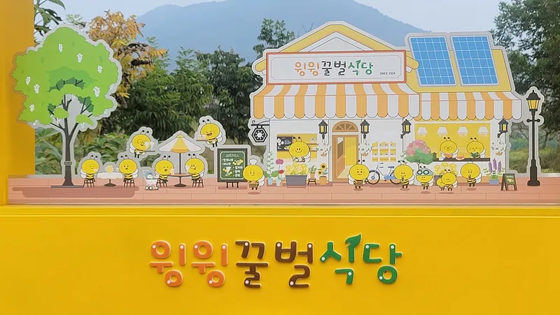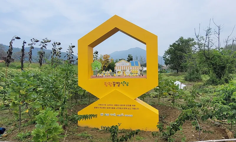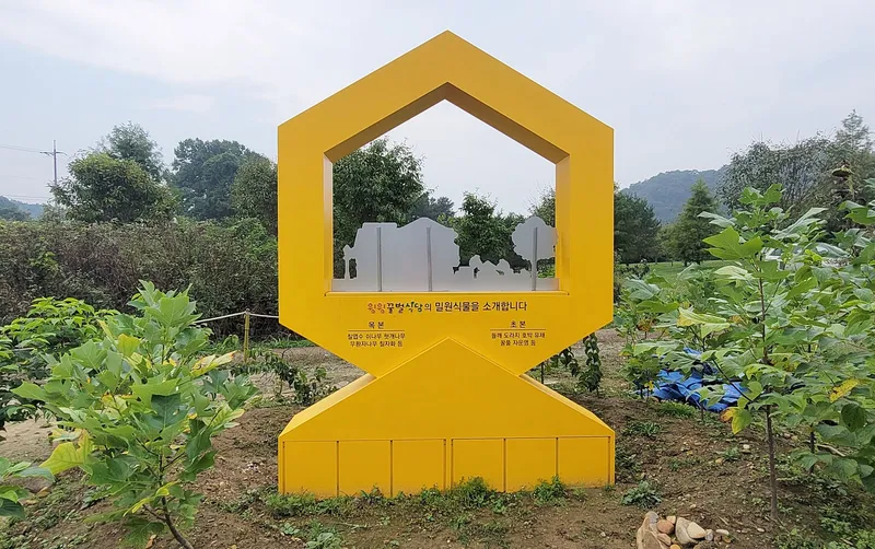 노란색의 '윙윙 꿀벌식당' 표시물 앞에는 양봉 꿀벌집 모형도 있습니다. 그럼, 이곳에는 어떤 씨를 뿌렸을지 알려드리겠습니다. 윙윙 꿀벌식당은 밀원식물 종류를 키우고 있습니다.