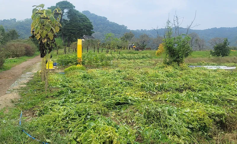 대덕구 미호동 앞에 도착했을 때 수확한 식물이 줄을 지어 누워있습니다. 처음 본 광경이라 이것이 뭔지 궁금증이 생겼습니다.
