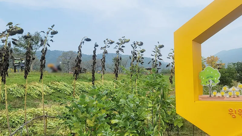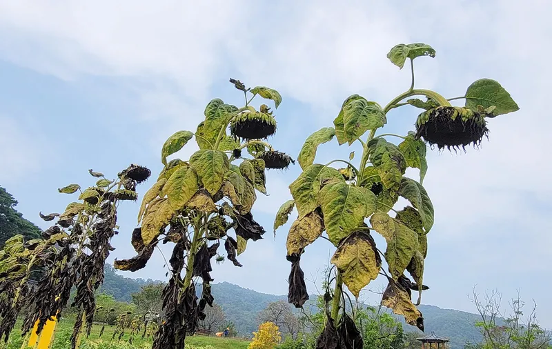 키가 훌쩍 큰 해바라기가 모두 공손하게 인사를 하며 방문객을 반겨주었습니다. 해바라기가 걸친 잎사귀란 옷이 좀 남루해 보이긴 하지만 내년에 더 많은 식구들과 돌아오기 위한 인사라고 생각이 들었습니다.