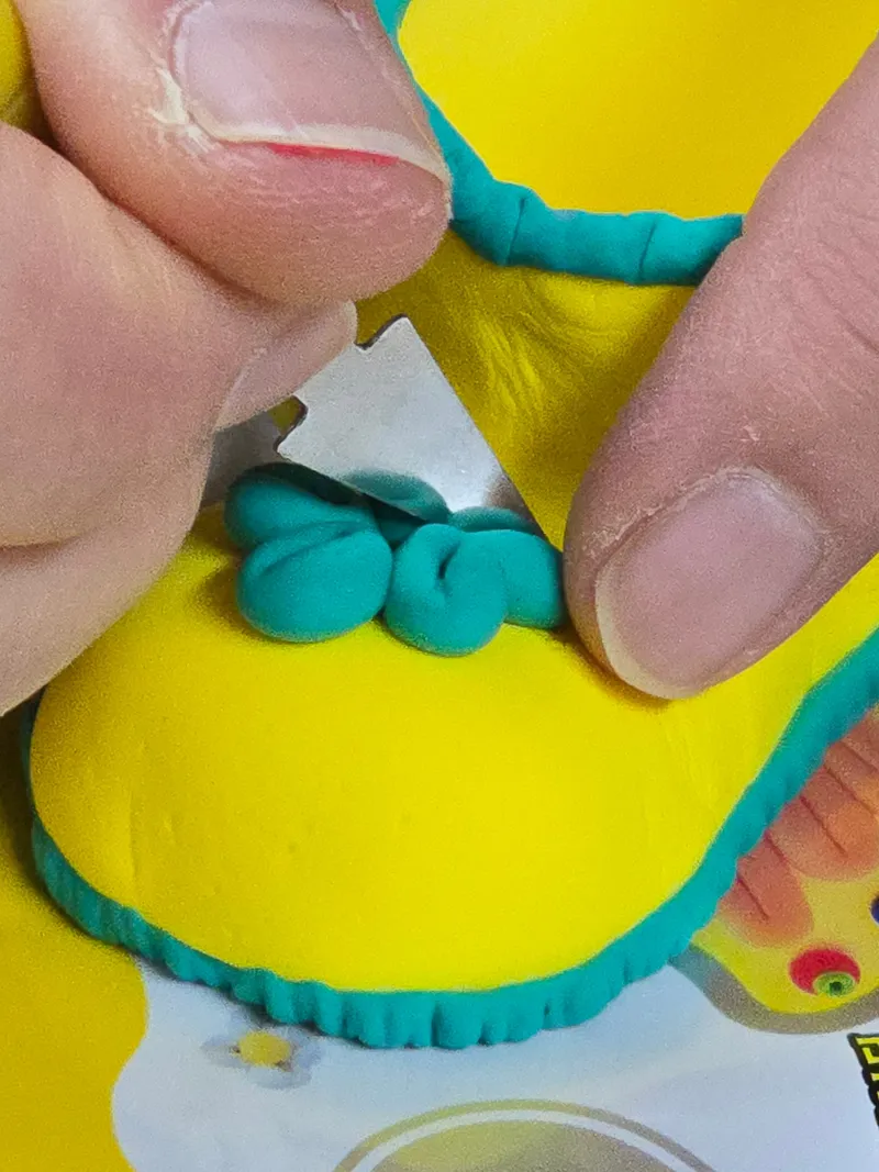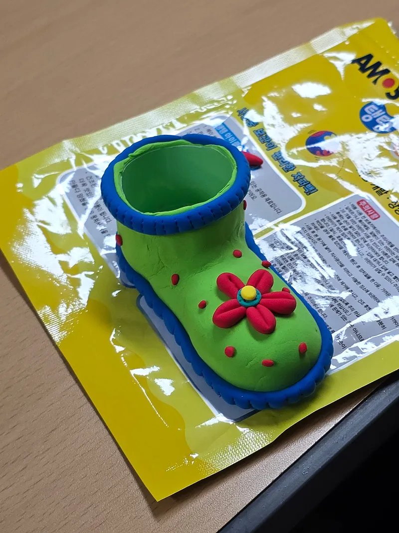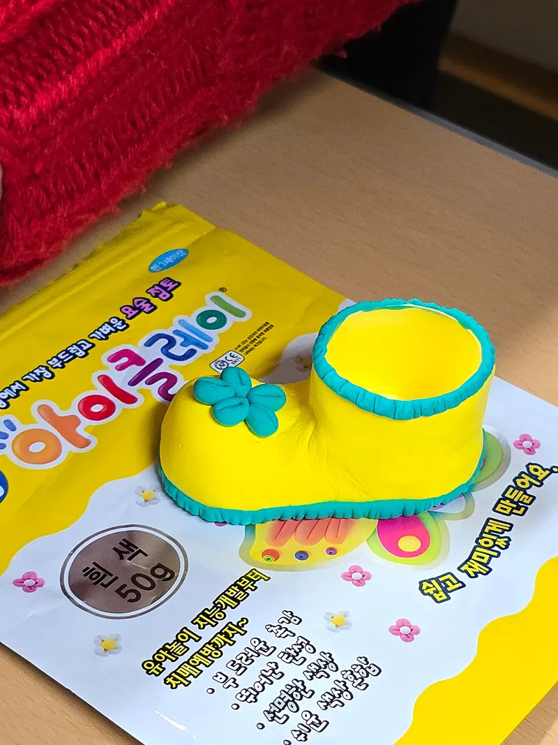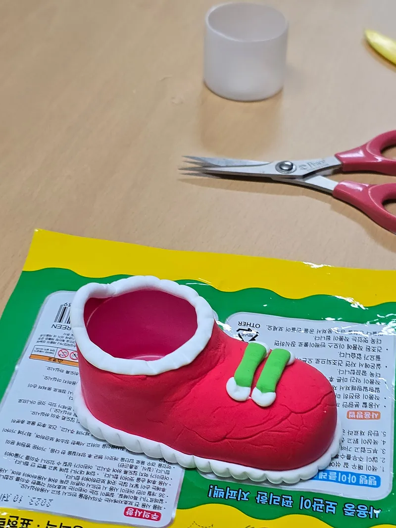 요구르트병을 잘라서 기둥을 세우고 클레이로 장식해서 신발 모양 장식품을 만들었습니다.