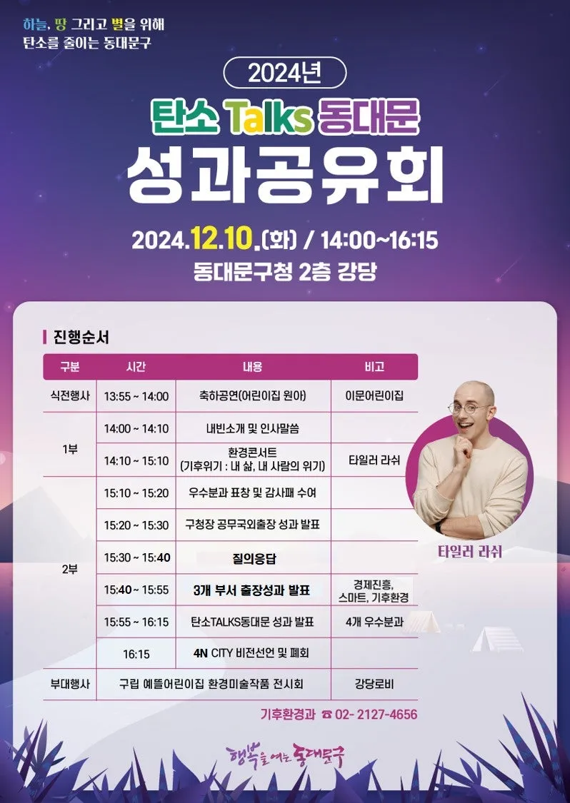 동대문구 탄소중립 주민실천 조직인 <탄소 Talks 동대문>에서 2024년 성과공유회를 개최합니다🌍 각종 방송에서 활약 중인 타일러 라쉬의 환경콘서트도 진행될 예정이니 많이 많이 참여해주세요! |