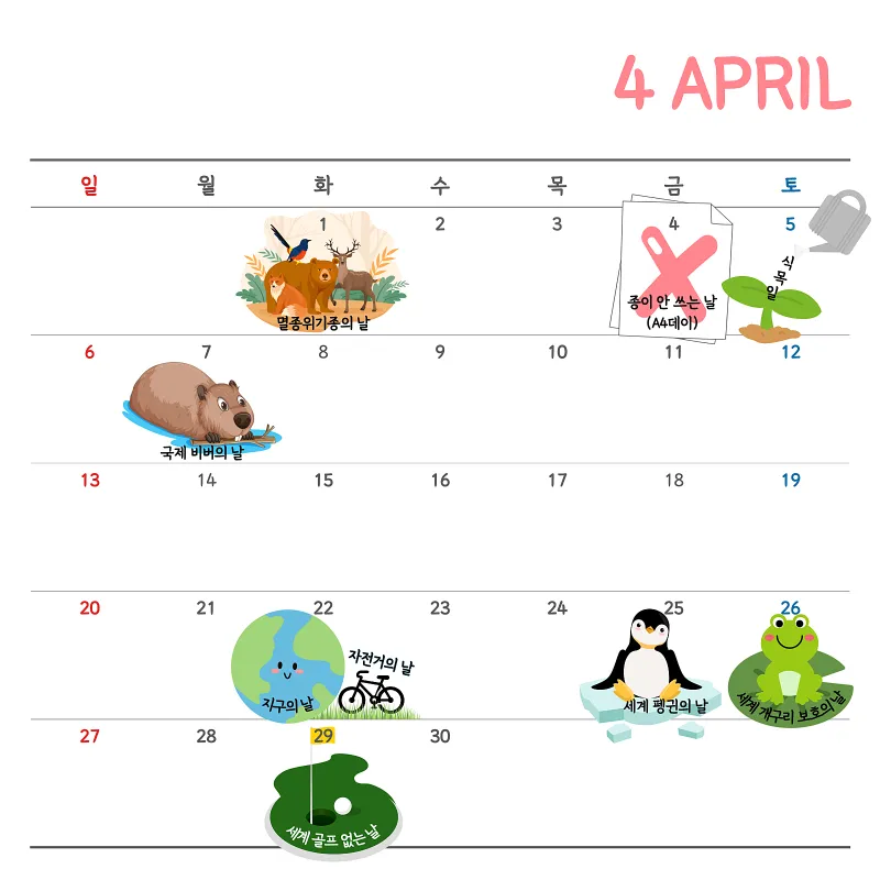식목일(5일), 지구의 날(22일), 펭귄의 날(25일),
