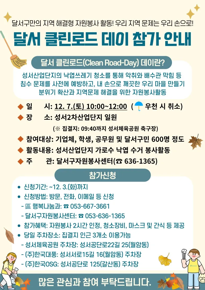 [대구 달서구] 우리 동네를 깨끗하게! 2024 달서 클린로드 데이」 봉사활동 참여자(단체)를 모집합니다~!