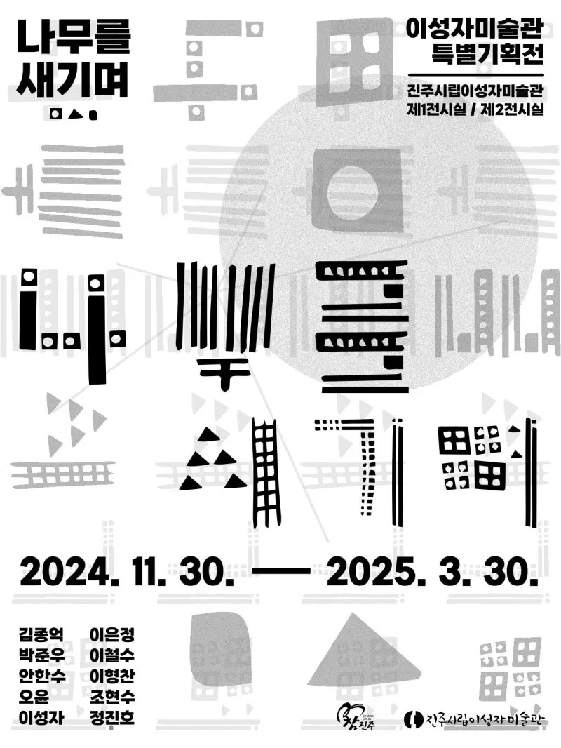❝ 나무를 새기며 展 ❞ ✅기간 : 2024. 11. 30.(토) ~ 2025. 3. 30.(일) ✅ 운영시간 : 10시~17시(입장마감 16:30) ※ 휴관일 : 매주 월요일, 1/1, 설날, 추석 ✅ 장소 : 진주시립이성자미술관 1, 2 전시실 ✅ 전시작품 : 회화, 설치, 조각 등 ✅ 전시내용 - 1969년 제1회 CAPRI 현대 목판화 트리엔날에서 발표한 글 <나무를 새기며> - 이성자 화백의 목판화 시대별 변화과정 - 1980년대 목판화가 그리고 동시대 작가들의 나무를 주제로 한 작품 - 다양한 작가들의 시각을 체험하고 교감 ✅ 전시연계 프로그램