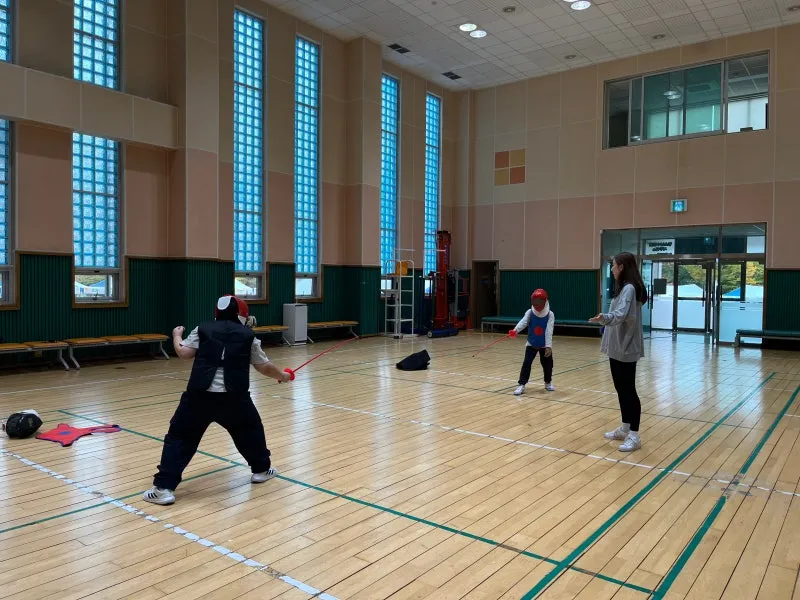 펜싱이 생각보다 어려웠지만 재밌었어요. 다리를 구부리고 하다 보니깐 하체 운동으로 너무 좋았어요.
