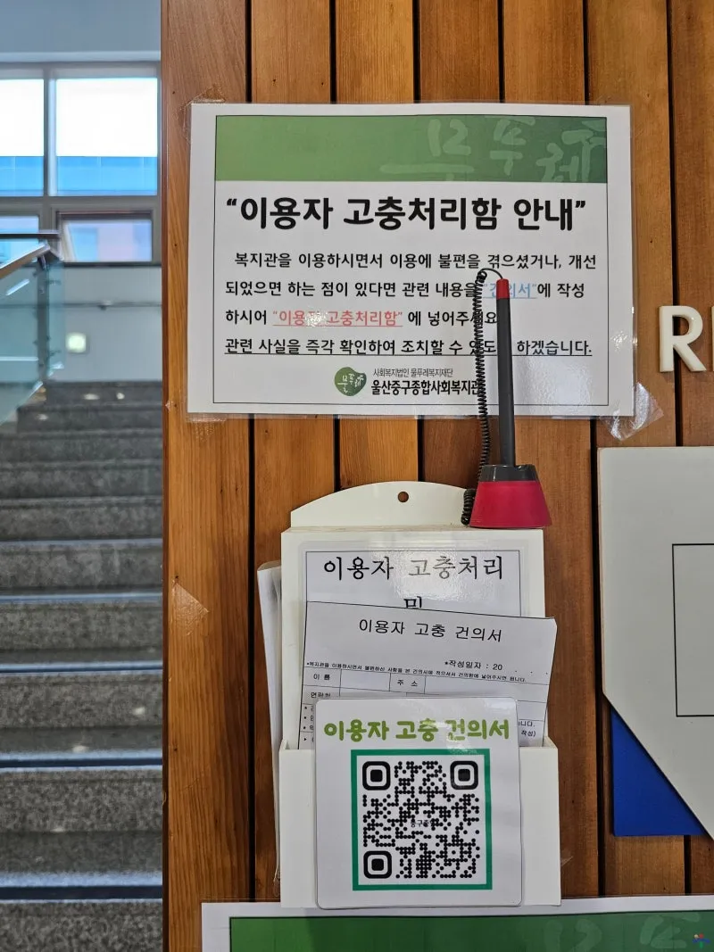 엘리베이터 앞에 있던 이용자 고충 건의서는 건의사항이 있으면 작성하시어 중구종합사회복지관이 좀 더 발전해 나가는 데 도움이 되도록 합니다.